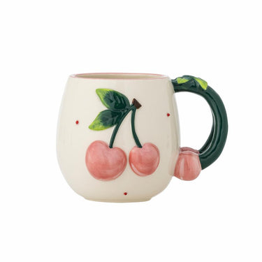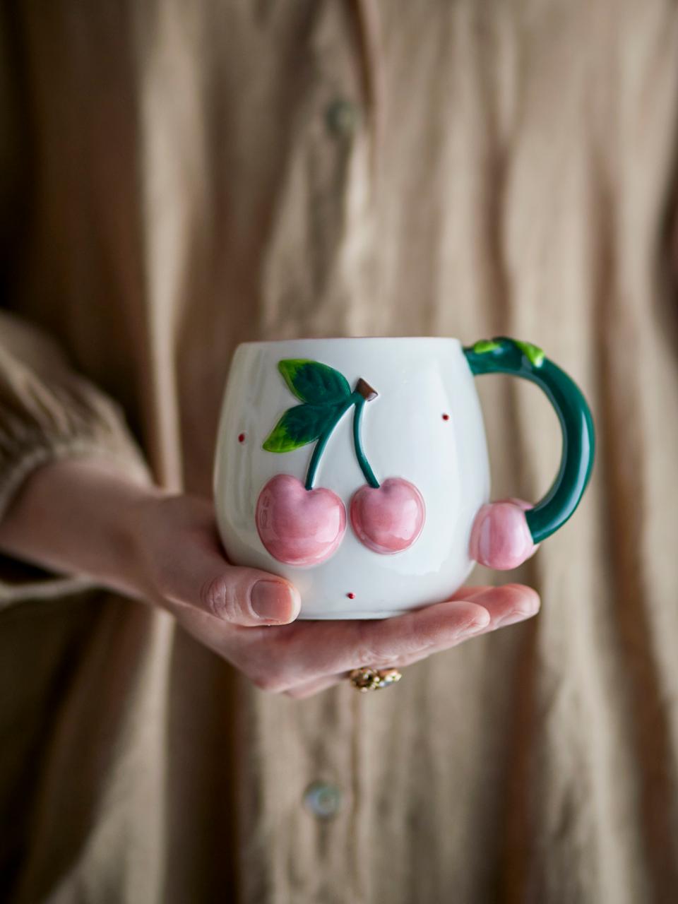 Entdecken Sie den Charme dieser Berrie-Tasse von Bloomingville, die die Schönheit der Natur in Ihr Zuhause bringt. Die abgerundete Form und die schöne cremige Oberfläche machen das Trinken aus dieser Tasse zu einem Vergnügen. Verziert mit rosafarbenen Kirschen und einem tiefgrünen Henkel mit Fruchtdetail ist jede Tasse handbemalt, sodass keine gleicht der anderen.