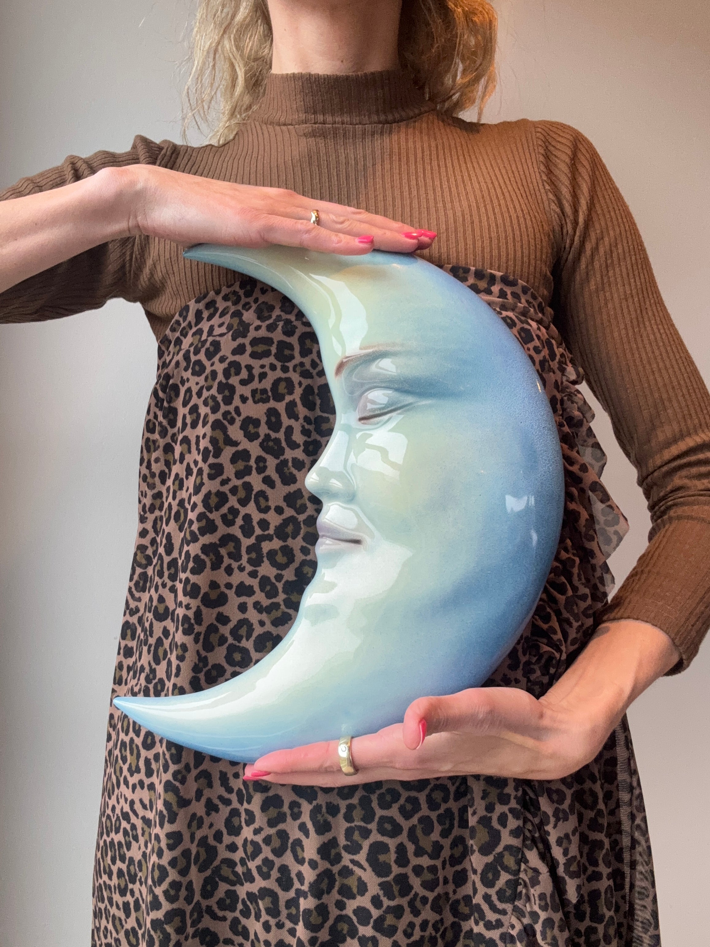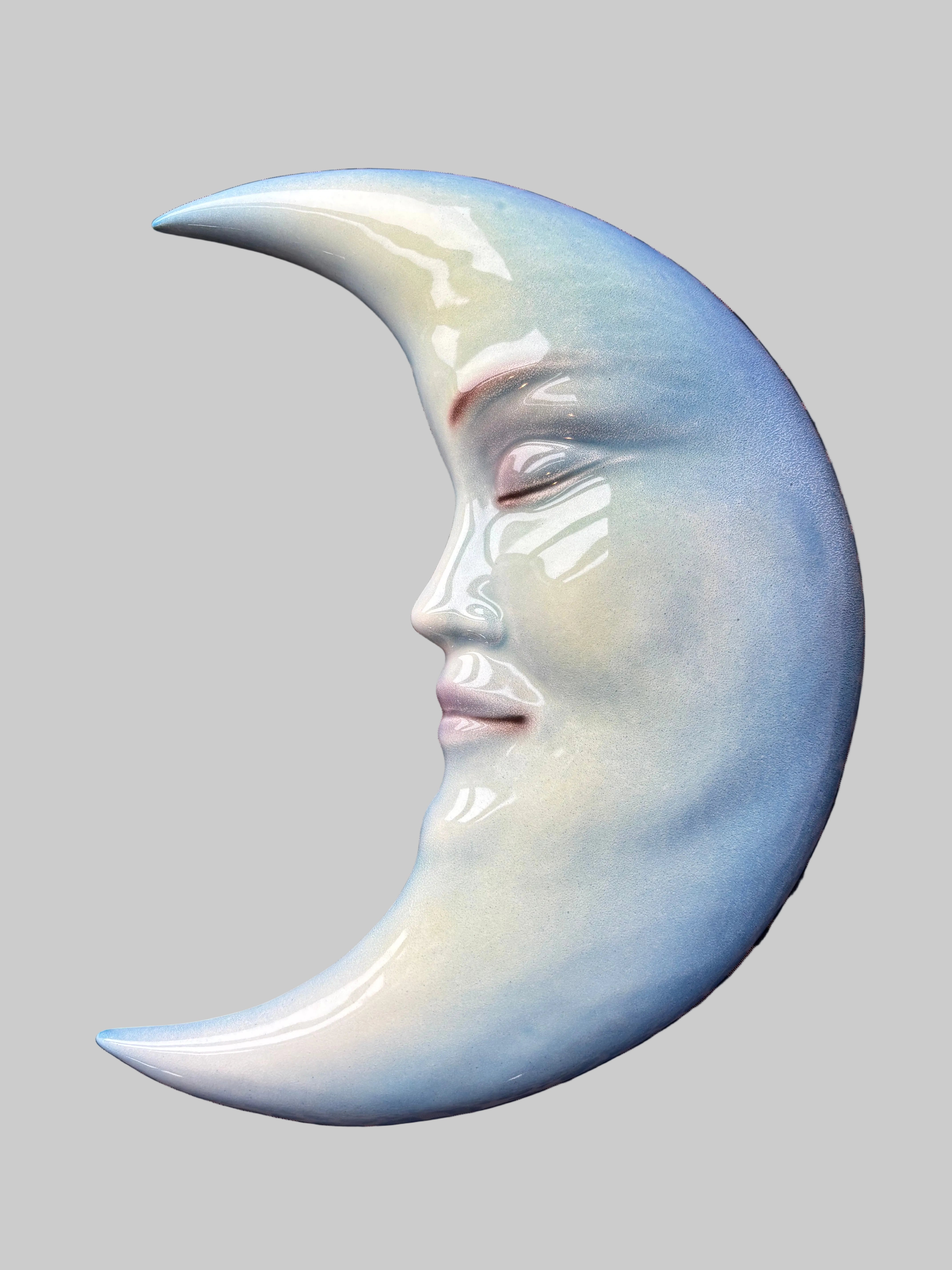 Diese blaue Mond-Wanddekoration wurde von einem Familienunternehmen aus italienischer Keramik hergestellt. Das charakteristische Design mit einem schlafenden Gesicht verleiht der Wanddekoration einen verspielten Ausdruck mit feinen Details. Die Wanddekoration ist in drei verschiedenen Größen erhältlich: klein (16 cm), mittel (27 cm) und groß (36 cm).