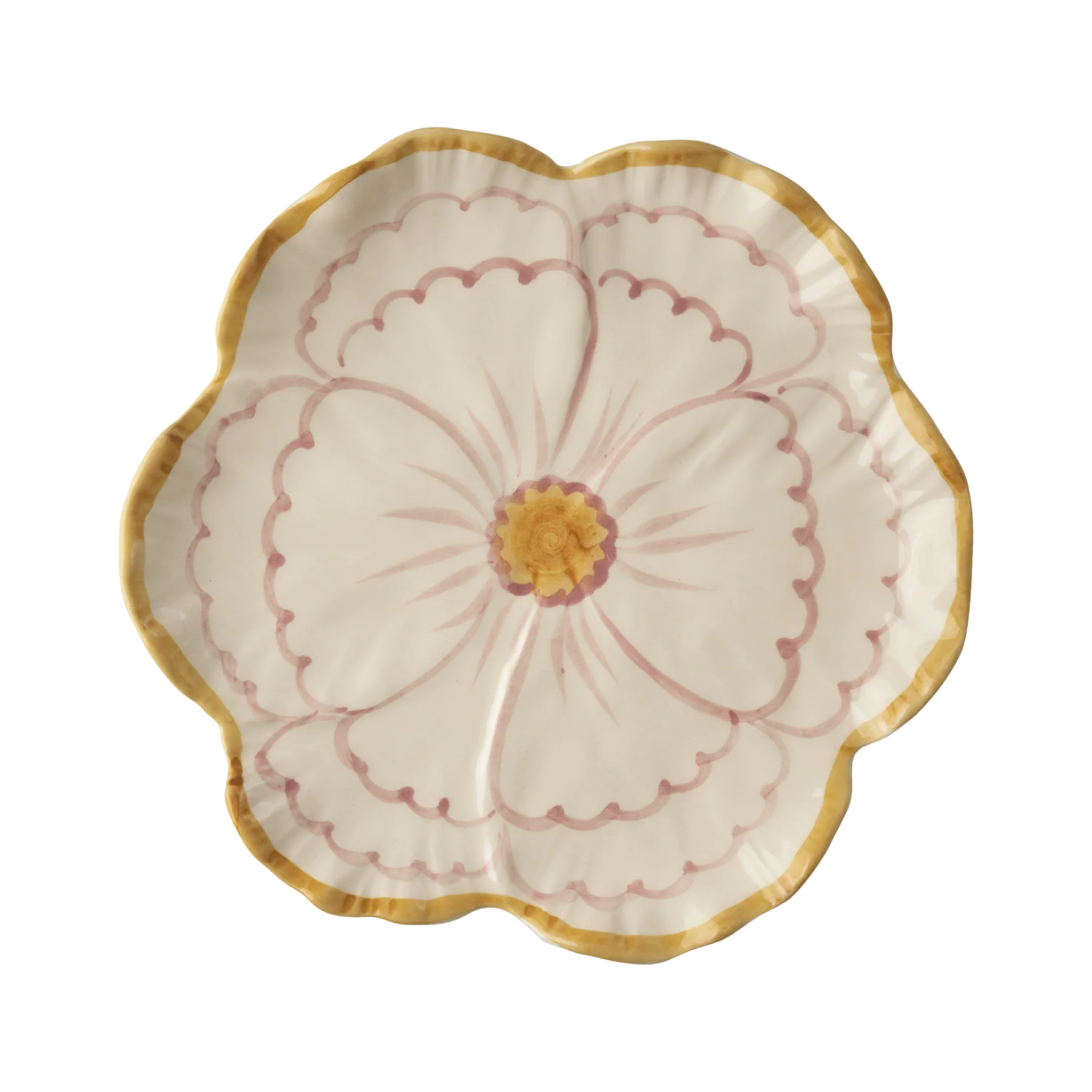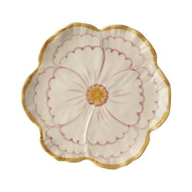 Geben Sie Ihrem Tisch eine einzigartige Note mit diesem schönen Blumenteller. Es eignet sich perfekt für den täglichen Gebrauch und die festlichen Anlässe, und seine farbenfrohen handgepackten Details in Gelb und Pink machen es zu einem echten Augenfänger.