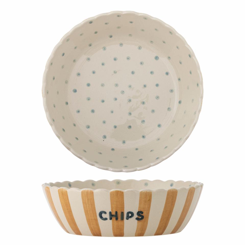 Verleihen Sie Ihren Snacks einen eleganten Look mit der Chips-Schale von Bloomingville. Diese Schale aus Steingut ist nicht nur praktisch, sondern auch ein wunderschönes Deko-Element, das jede Zusammenkunft aufpeppen kann. Mit ihrem handgemalten Design mit vertikalen Streifen auf der Außenseite und sanften blauen Punkten auf der Innenseite wird jede Schale zu einem einzigartigen Kunstwerk.