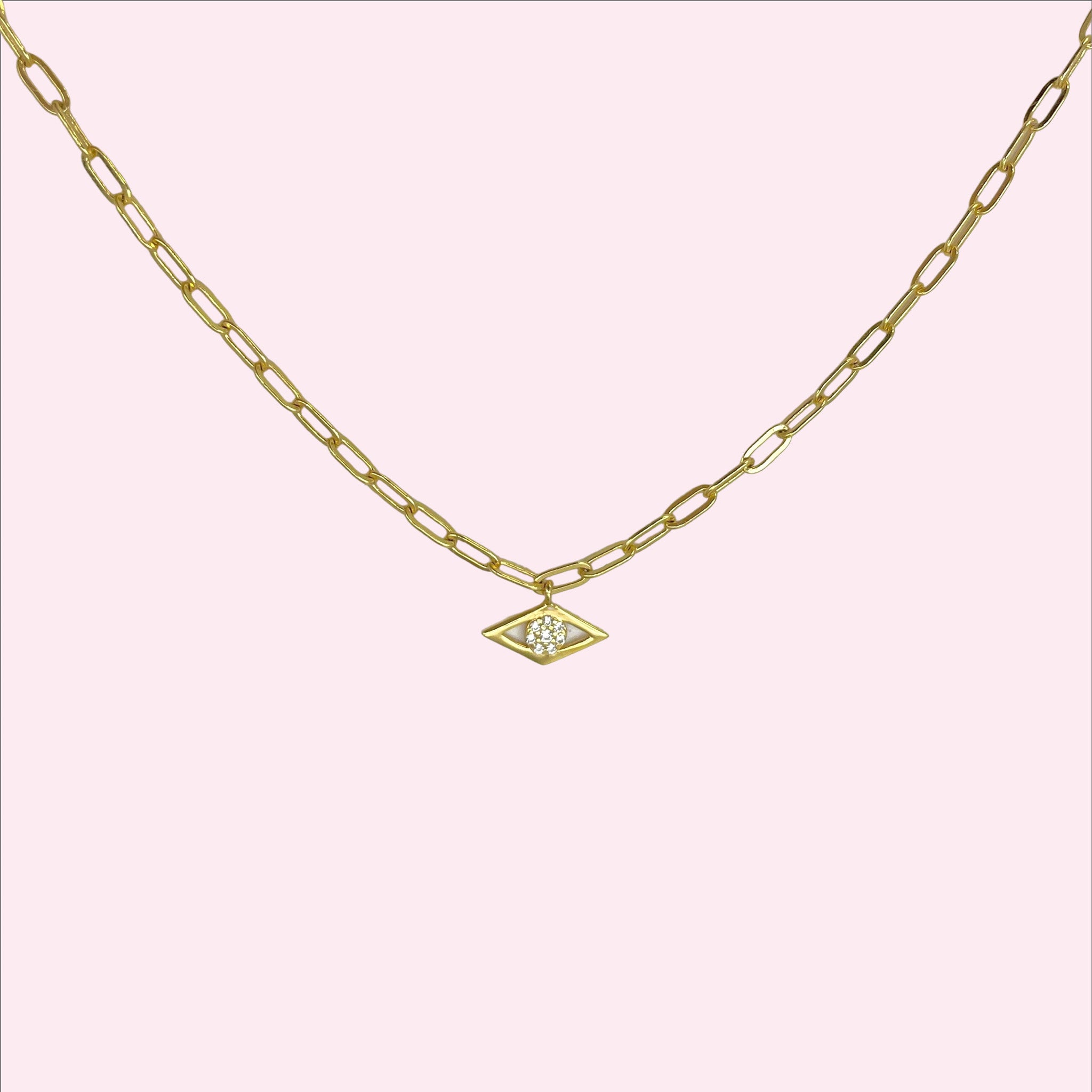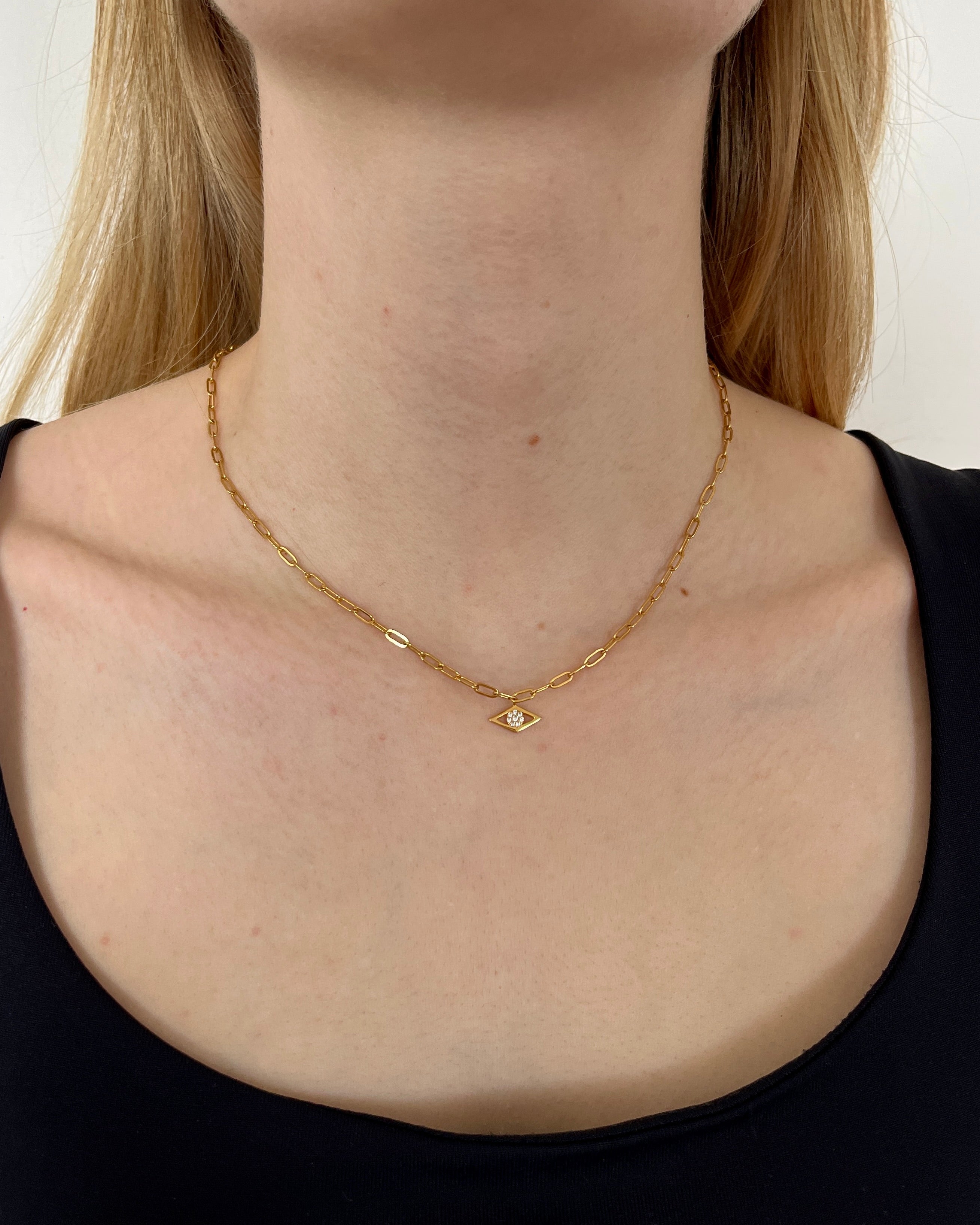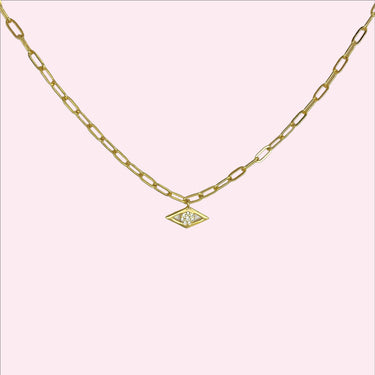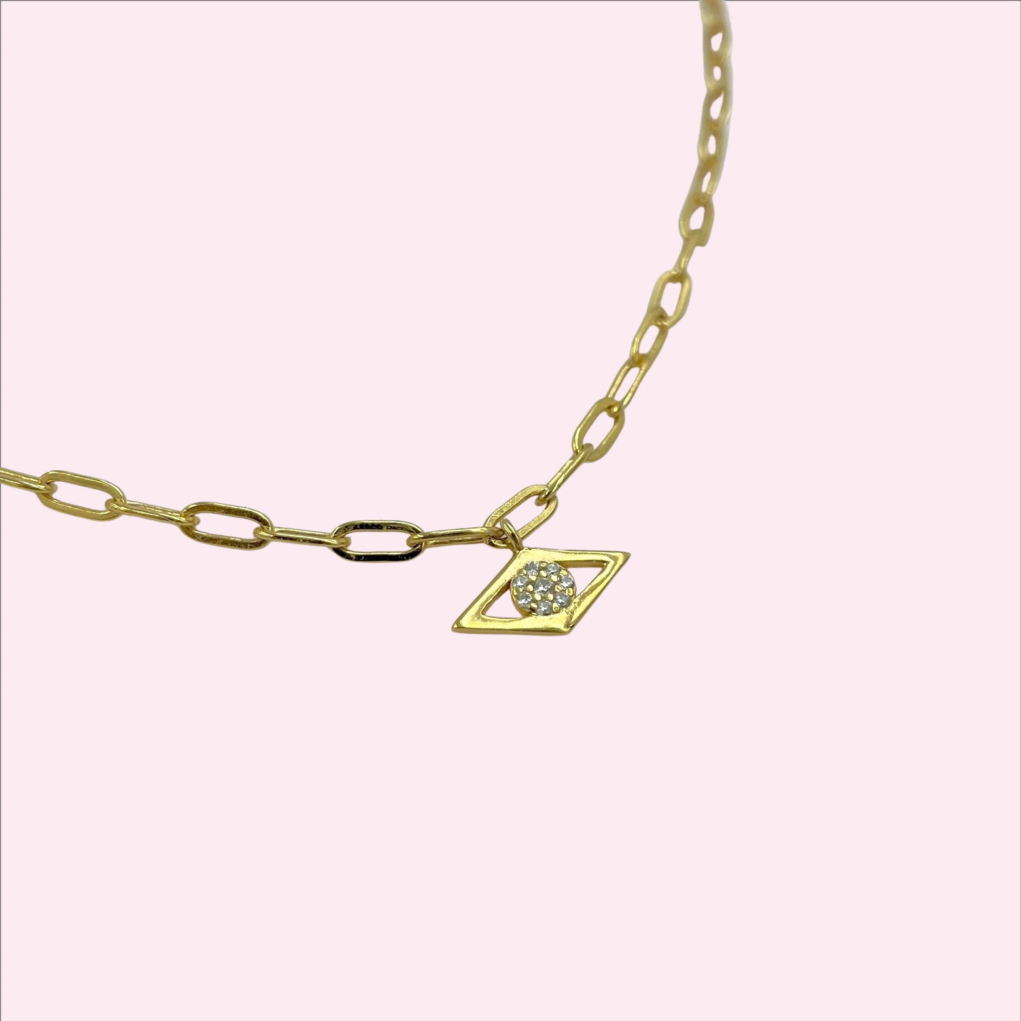 Die Kette selbst in der Destina -Halskette besteht aus größeren Gelenken und verleiht ihr eine charakteristische Struktur. In der Kette hängt ein einfacher, von Rhombus verdrängter Anhänger mit einer funkelnden Mitte klarer Steine.