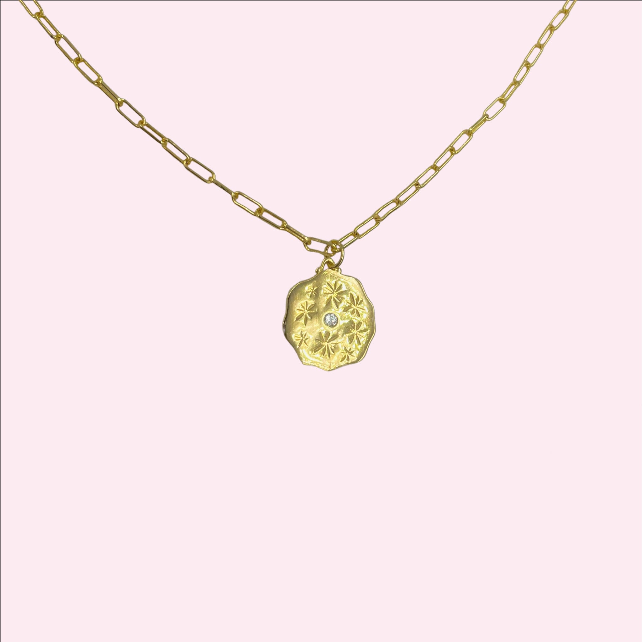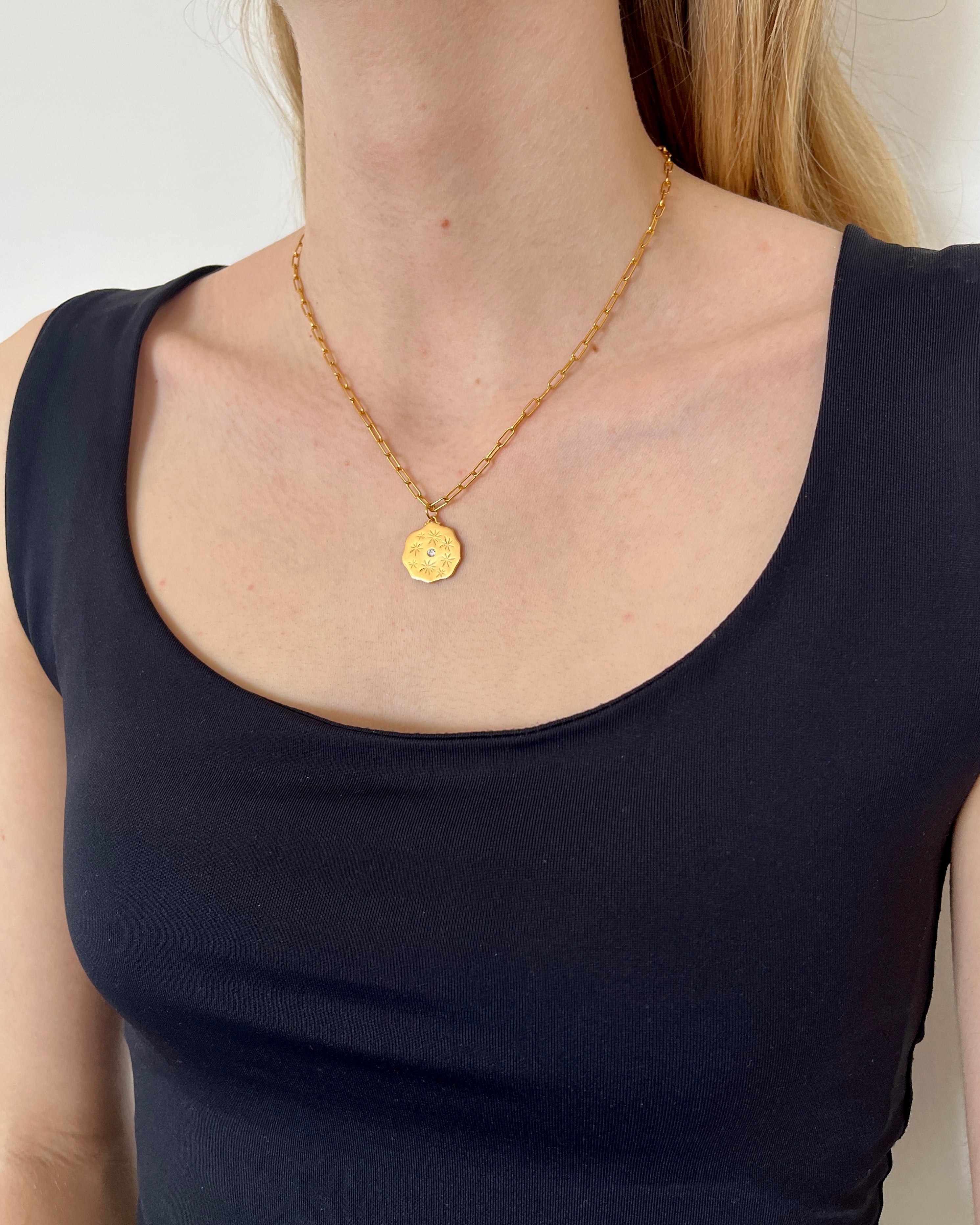 Die Fortika -Halskette hat gleichzeitig einen auffälligen, mysteriösen und abenteuerlichen Anhänger. Der runde Anhänger ist in Oberfläche und Kante rustikal. In der Mitte des Anhängers sitzt ein klarer Stein, der von kleinen gravierten Sternen umgeben ist. Auf diese Weise erinnert die Fortika -Halskette an einen Sternenhimmel, an dem einige Sterne klarer sind als andere.