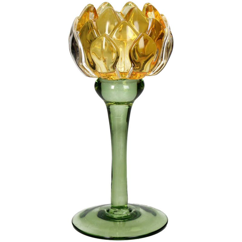 Dieser Kerzenhalter aus Glas mit dem Motiv einer gelben Blume verleiht jedem Raum einen zarten Hauch von Frühling. Mit seiner kompakten Größe von 8x8x17,5 cm passt er perfekt auf den Couchtisch, auf die Fensterbank oder als Teil einer größeren Dekoration und verbreitet dort eine warme und gemütliche Atmosphäre.