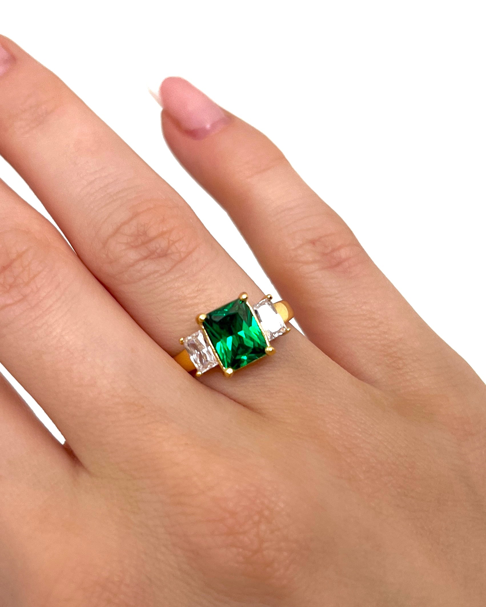 Die klare grüne Farbe, die den Glama -Ring durch den glamourösen Stein in der Mitte des Rings charakterisiert, ist ein Symbol für Natur, Wachstum und Gesundheit. Wie der Rahmen um den schönen grünen Stein gibt es auf jeder Seite einen kleineren Stein.