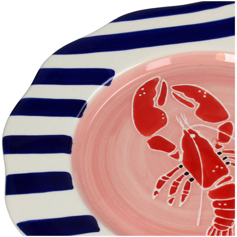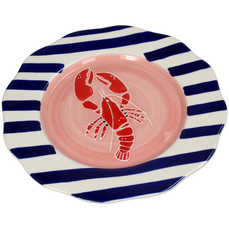 Mit der Hummerplatte von Kersten bringen Sie die frische Meeresluft in Ihr Zuhause. Diese wunderschöne Keramikplatte ziert ein roter Hummer in der Mitte, umgeben von blauen und weißen Streifen, wodurch sie sich ideal für Sommerfeste und nautische Themen eignet. Die Platte ist nicht nur dekorativ, sondern auch funktional und eignet sich perfekt zum Servieren köstlicher Gerichte.