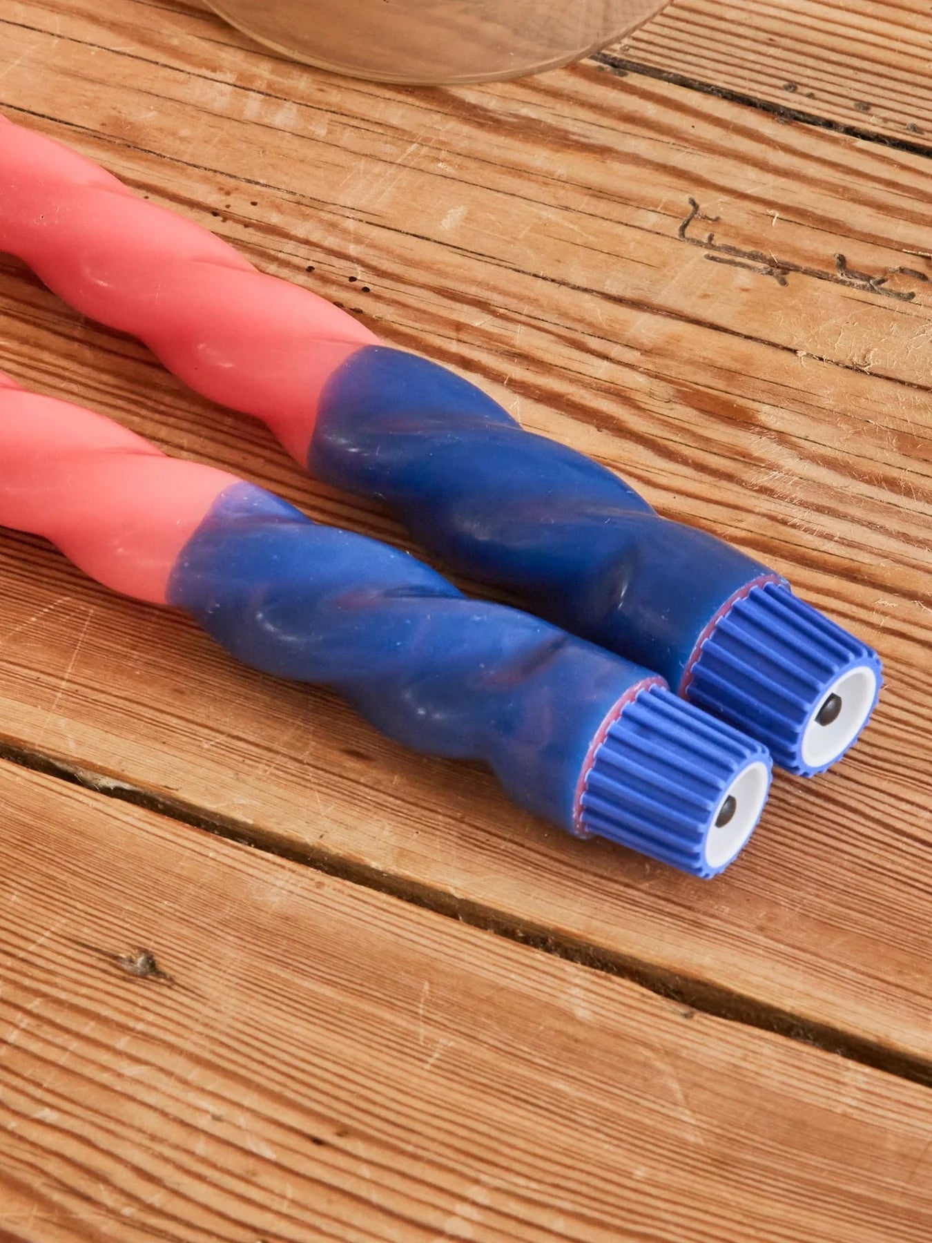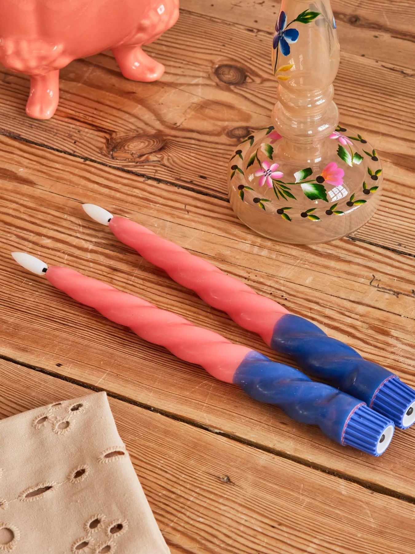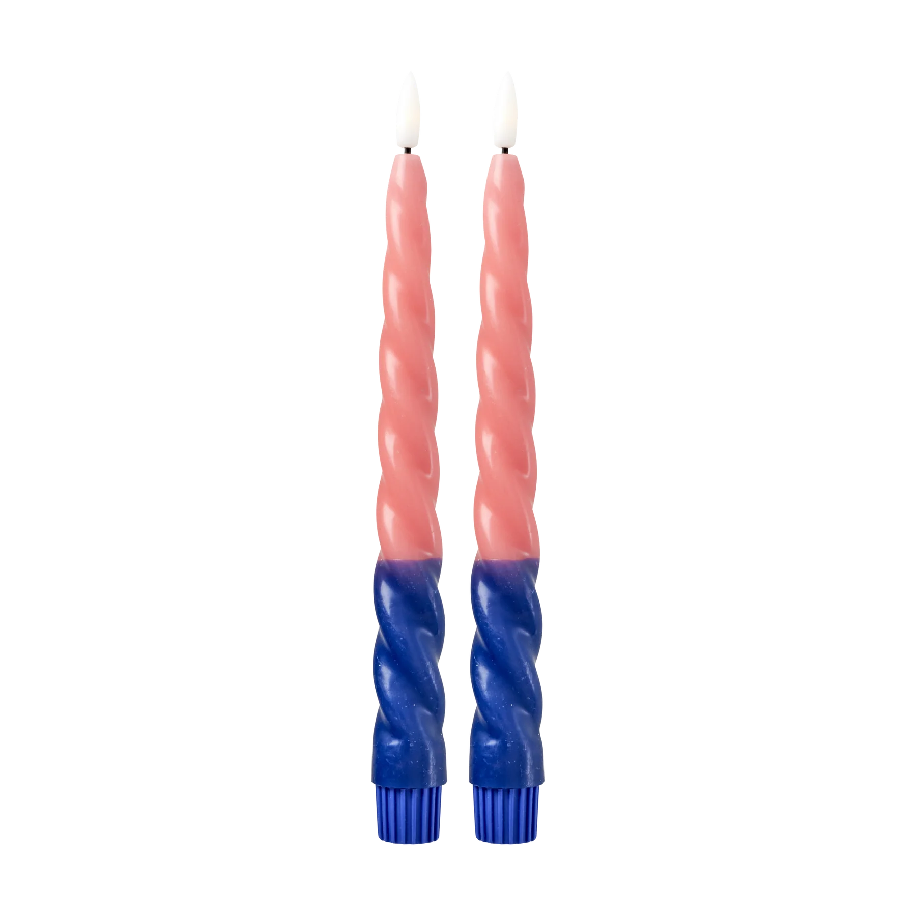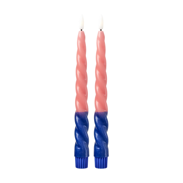 Oplev den perfekte kombination af stil og atmosfære med disse snoede LED stearinlys i koral og navy blå. Lysene leveres i et praktisk sæt af to og vil uden tvivl bringe en varm og indbydende stemning til dit hjem. De livagtige, flimrende flammer skaber en hyggelig atmosfære, og med deres voksbelægning ligner de rigtige stearinlys til forveksling.