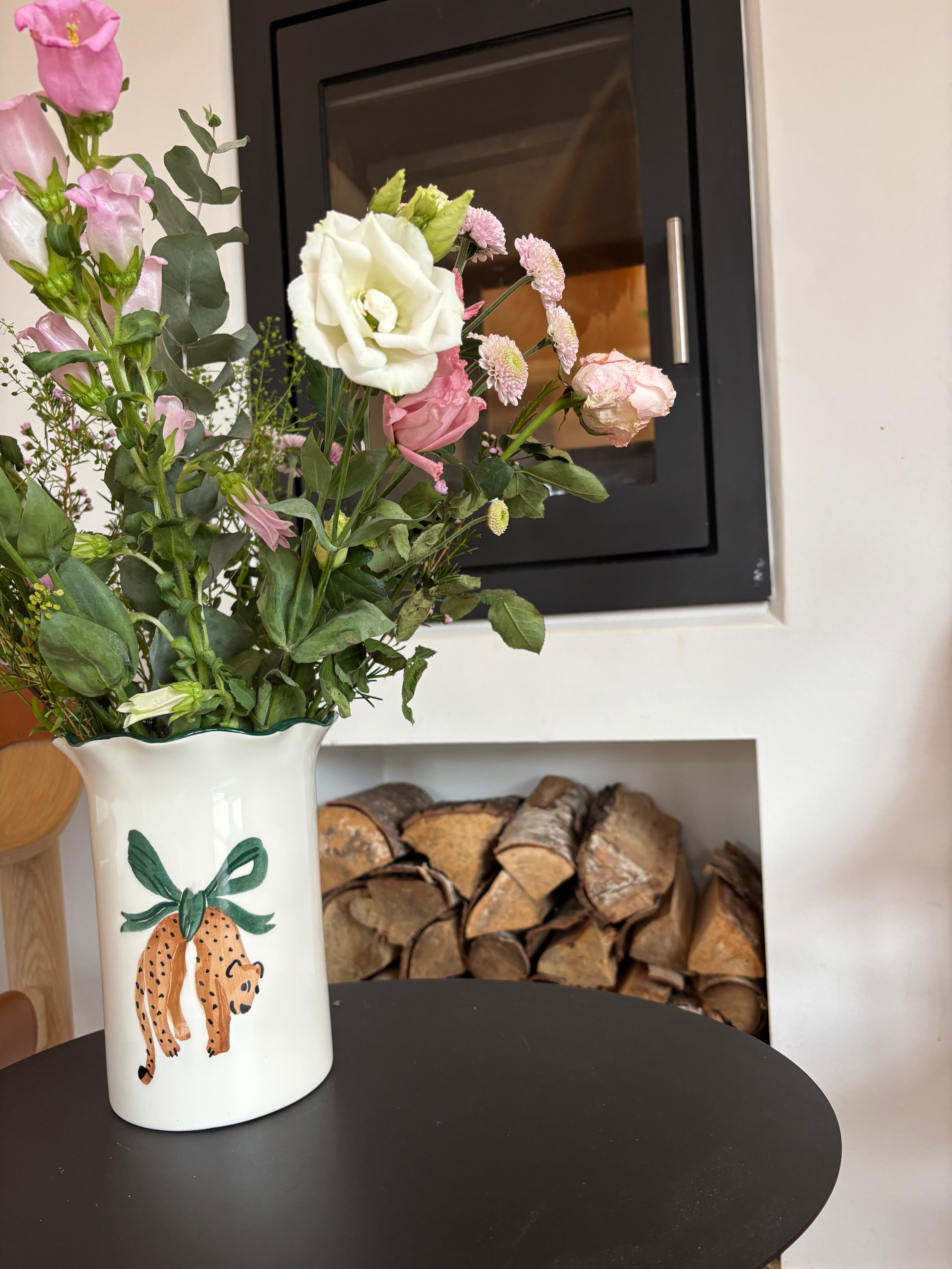 Diese handbemalte Leopardenvase von Anna + Nina ist aus Steingut gefertigt und vereint Funktion mit einem auffälligen Design. Die geformten Ränder und das charakteristische Leopardenmuster verleihen der Vase einen einzigartigen Look, der sowohl für Blumen als auch als dekoratives Element im Zuhause verwendet werden kann.