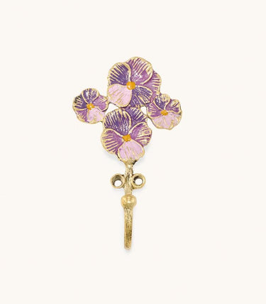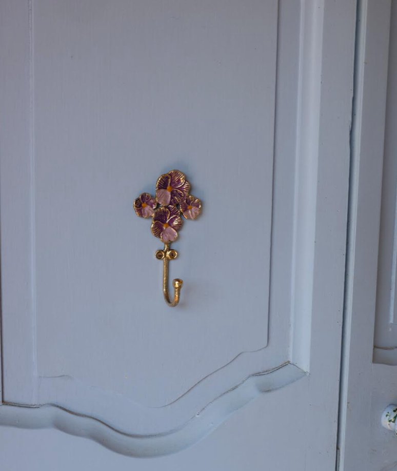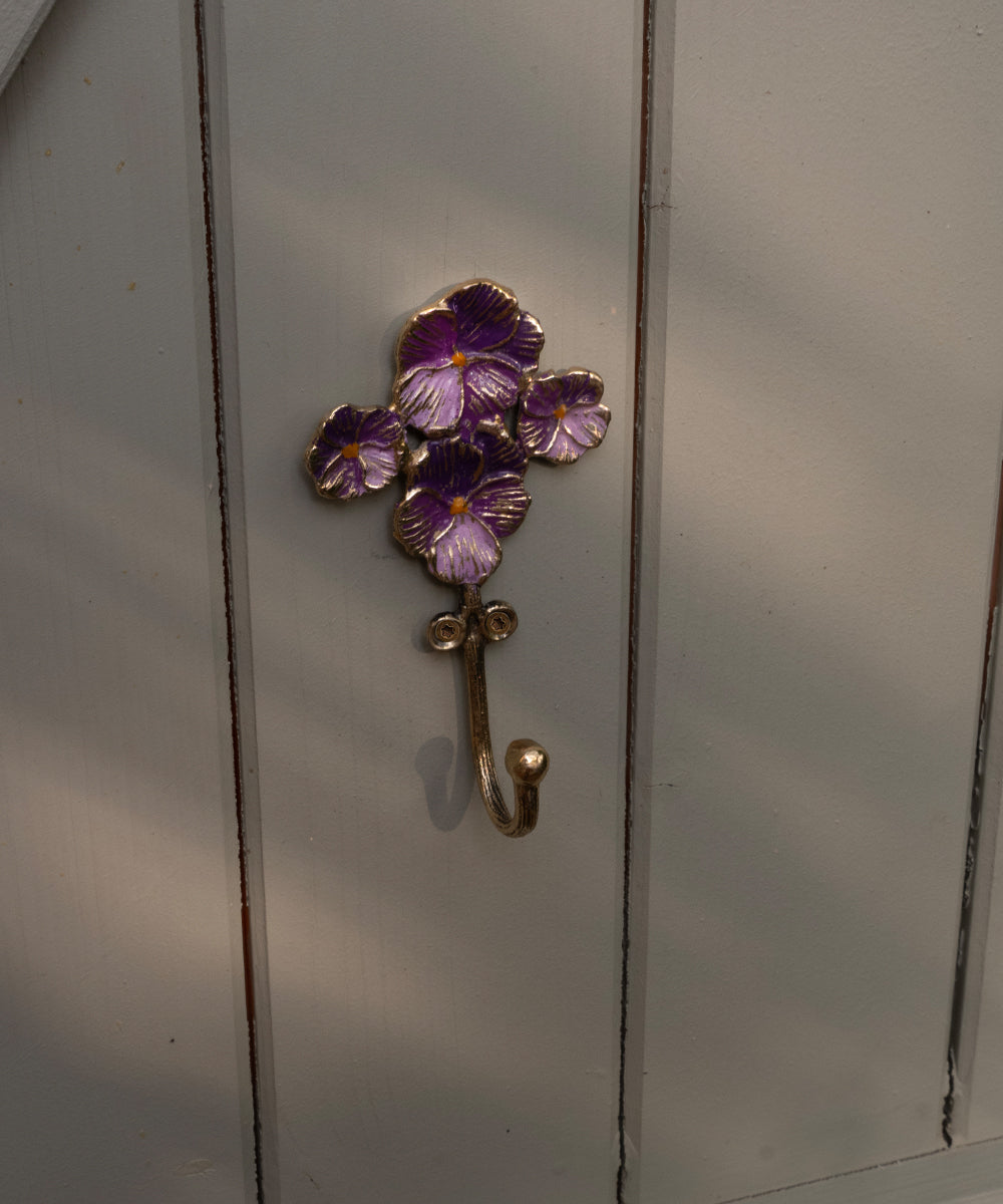 Dieser süße Blumenhaken hat vier Blumen in lila Farbtönen. Die Blumen des Hakens haben unterschiedliche Größen, wodurch das Motiv der Haken an ein sommerliches Blumenfeld oder ein schönes Blumenstrauß erinnert wird. Die Farben des Knöchels gehen wunderschön in Spin mit der heißen Goldfarbe des Messing, die während der Farbe erscheint werden kann.