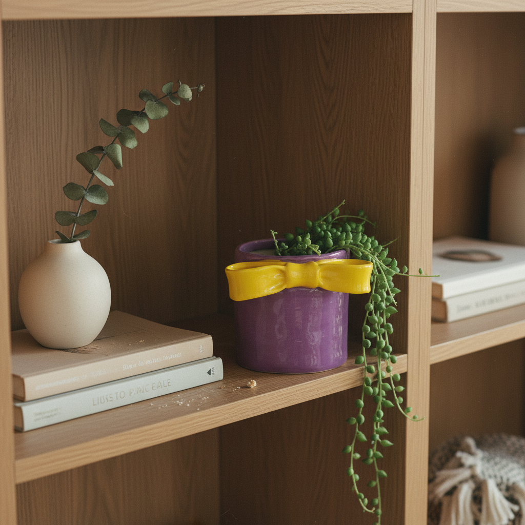 Lila Blumentopf mit gelber Schleife für Ihr Zuhause
