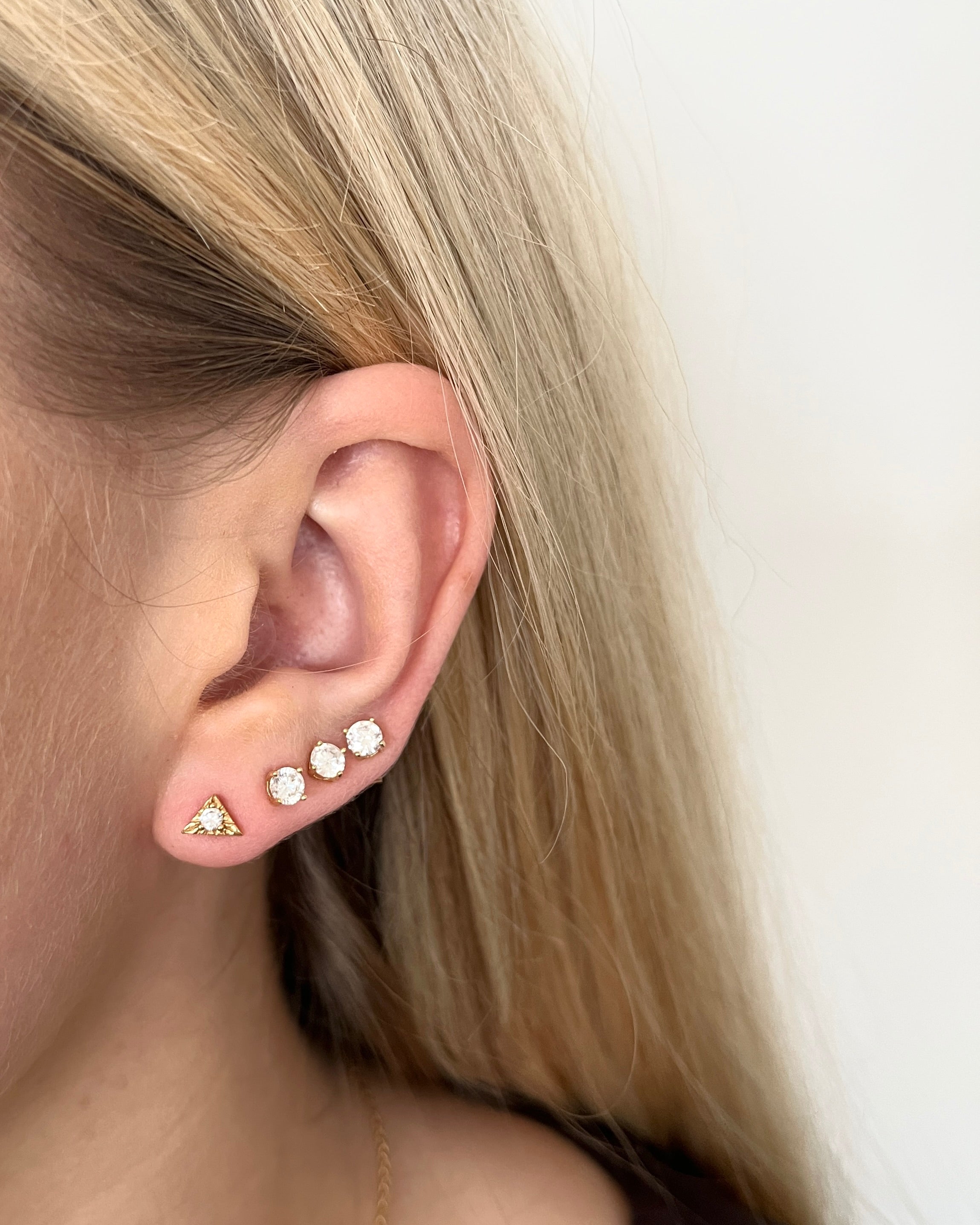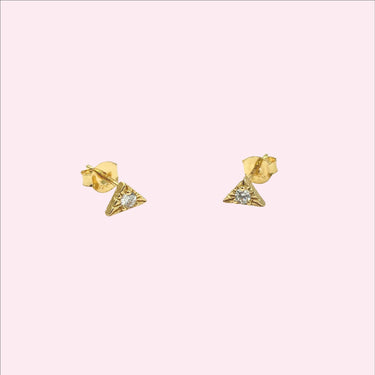 Die feinen Ohrringe sind wie Dreiecke geformt. In Kombination mit der goldenen Farbe des Ohrrings kann die Form fast an eine Pyramide erinnern. In der Mitte des Dreiecks befindet sich ein wunderschöner klarer Stein, der den Offenlegungsohrring zum Glanz bringt.