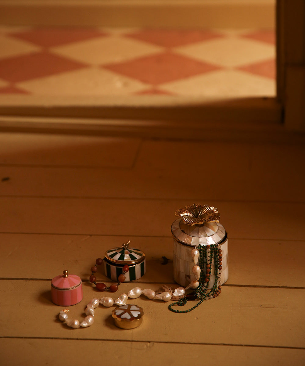 Hold styr på dine yndlingssmykker med denne charmerende pink circus krukke. Håndlavet i Indien, denne fantastiske opbevaringsløsning er fremstillet af genbrugsbrass og resin, hvilket betyder, at dit køb støtter lokale håndværkere og deres samfund.