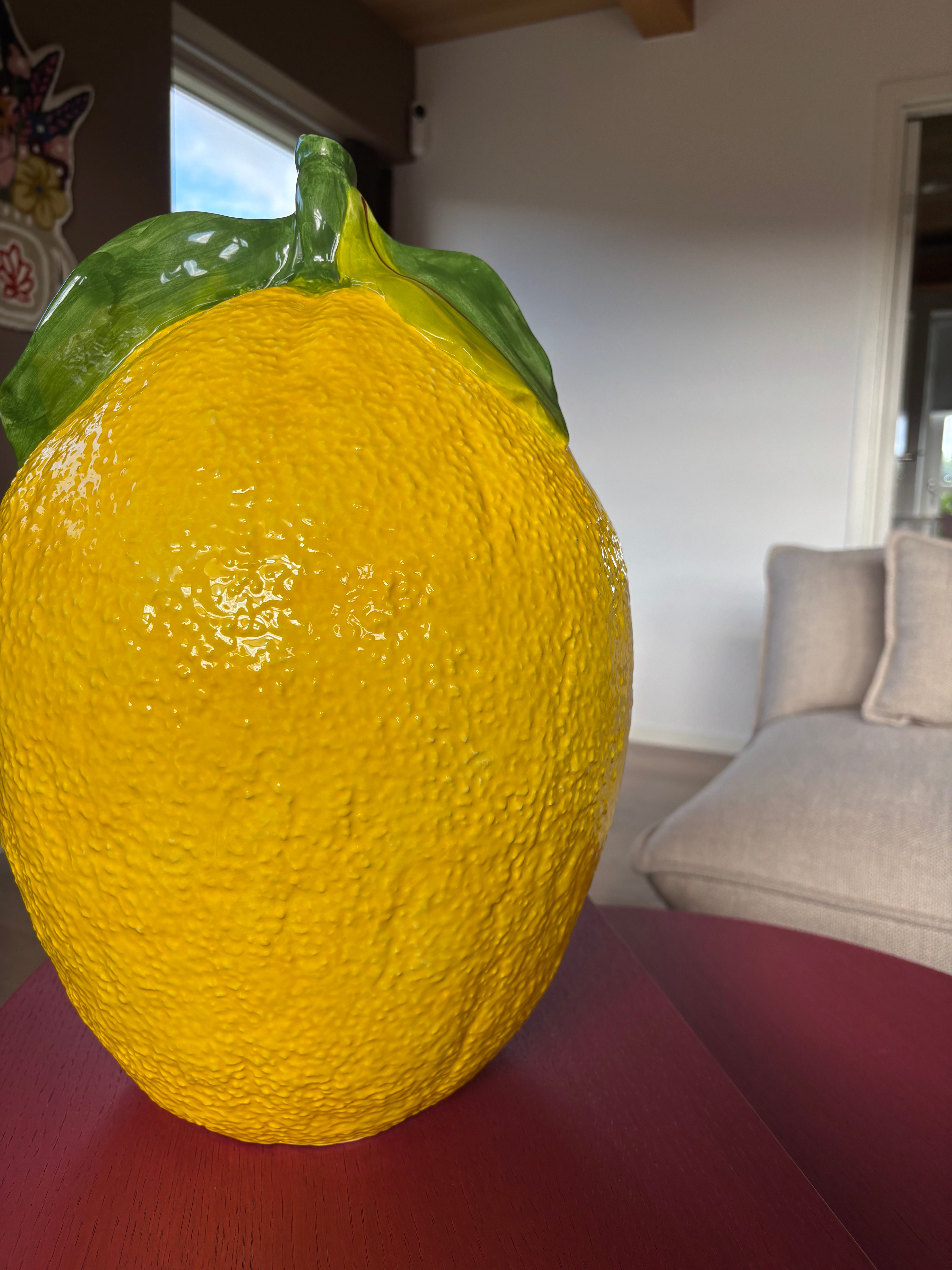 Diese Zitronenfigur ist aus echter italienischer Keramik gefertigt und von erfahrenen Künstlern handbemalt. Mit einer Höhe von 46 cm ist die gelbe Zitrone ein Blickfang in Ihrer Einrichtung, egal ob auf der Fensterbank, auf dem Boden oder auf einem Beistelltisch.