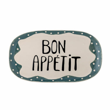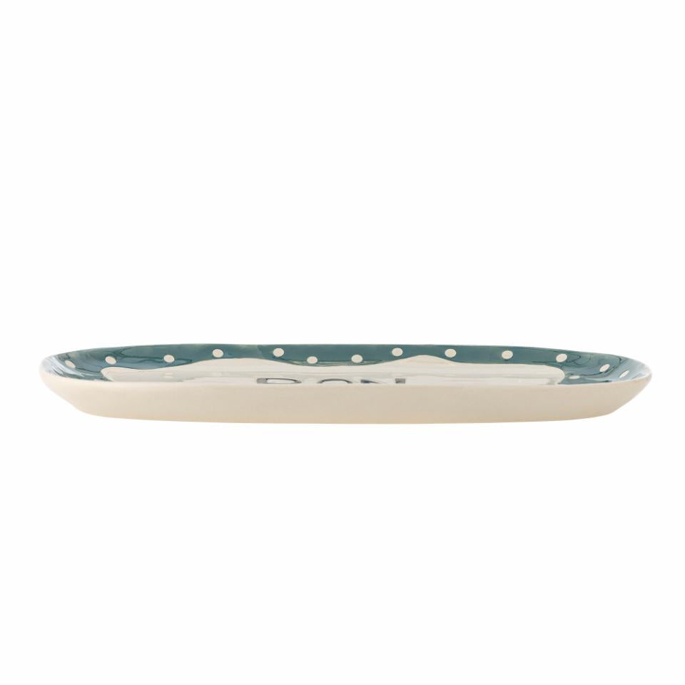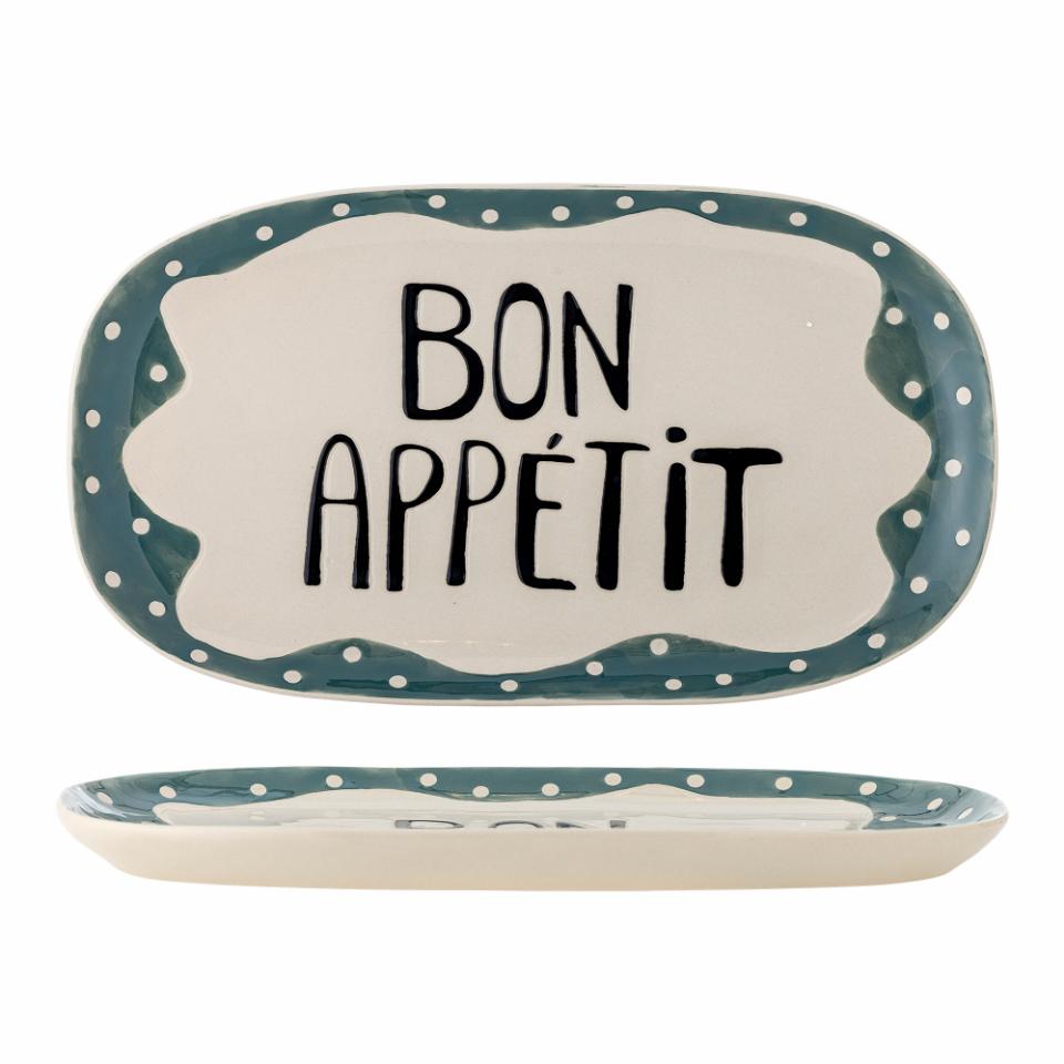 Diese schöne Servierplatte von Bloomingville ist eine perfekte Ergänzung für jede Tischdekoration. Das handbemalte Steingut mit dem Schriftzug „Bon Appétit” in der Mitte verleiht ihr eine persönliche Note, während die weichen Linien und kleinen Punkte am Rand die Platte zu einem dekorativen Detail auf Ihrem Esstisch machen.