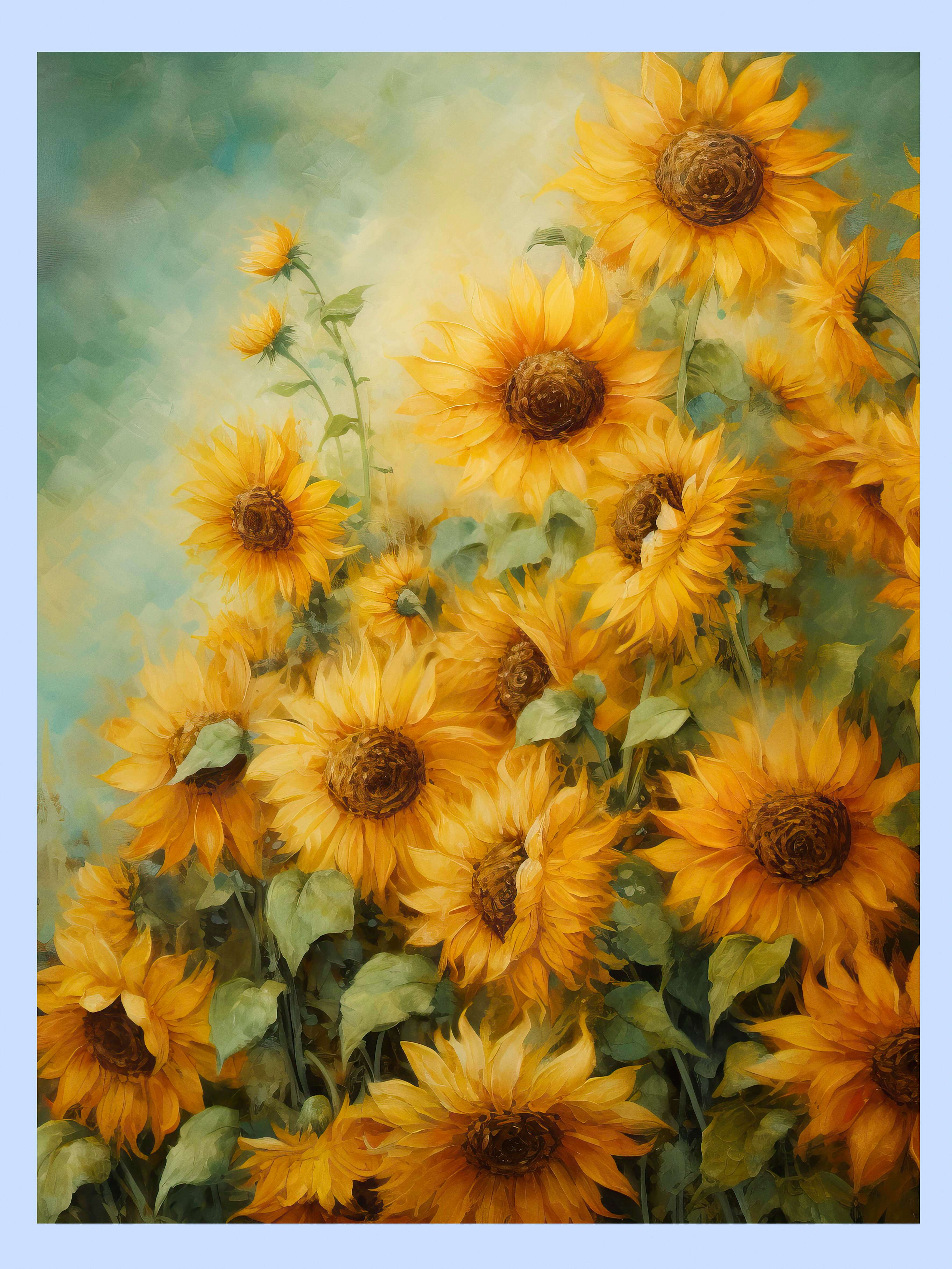 Das Bild Sonnenblume Oldschool fängt die Essenz des Sommers mit seiner lebhaften Produktion von Sonnenblumen ein. Die Arbeit wird von einem nostalgischen Charme getragen, in dem sich die goldenen Blüten in Richtung des Lichts auf einem Hintergrund erstrecken, der weiche blaue und grüne Töne mischt und eine verträumte Atmosphäre entsteht. Die Textur der Sonnenblumen ist reich und detailliert und verleiht jeder Blume eine schöne Sinnlichkeit. Diese Komposition huldigt die Schönheit der Natur mit einer alten Ästhetik sowie Pinselstriche, die an klassische malerische Techniken und den Lauf der Zeit erinnern.
