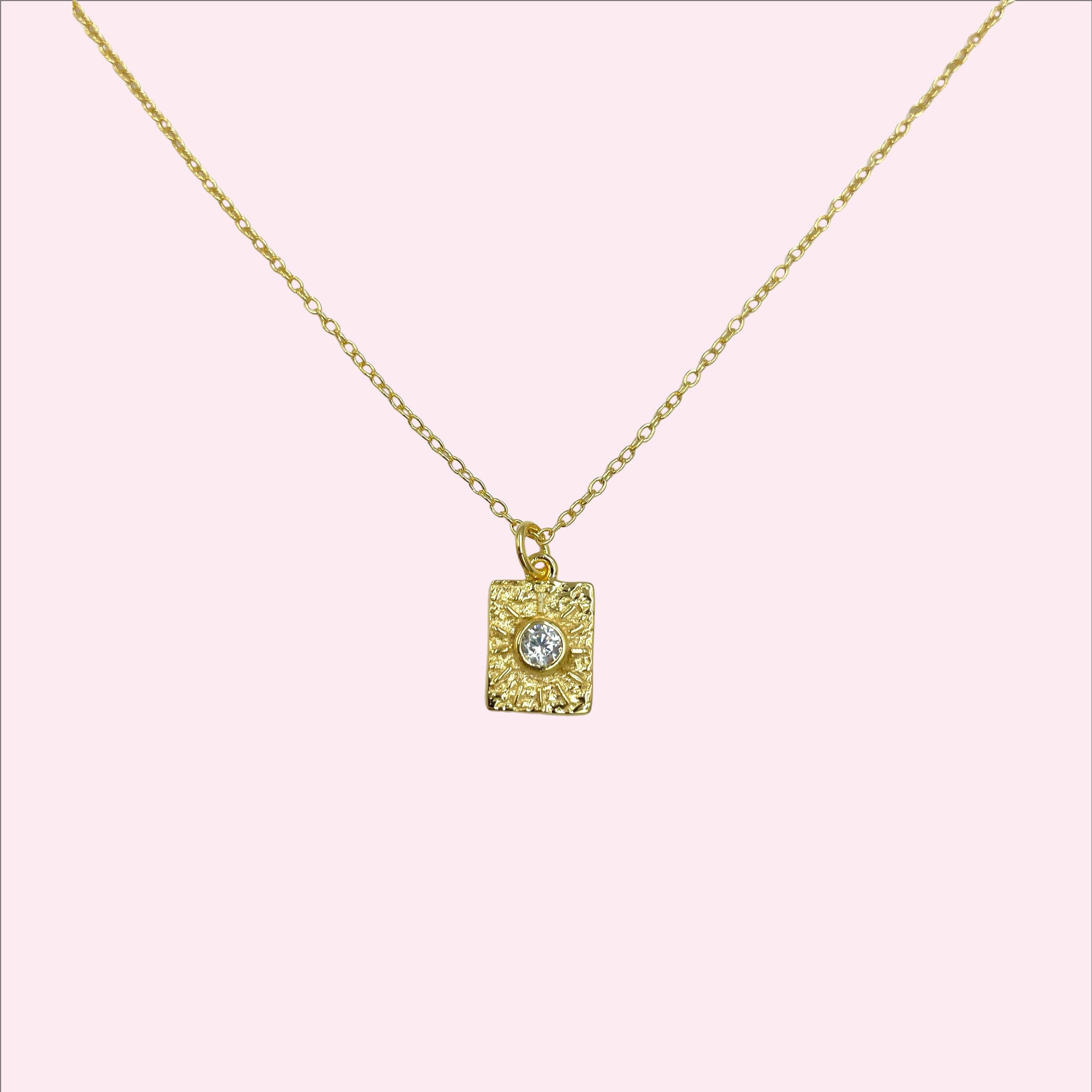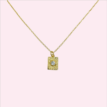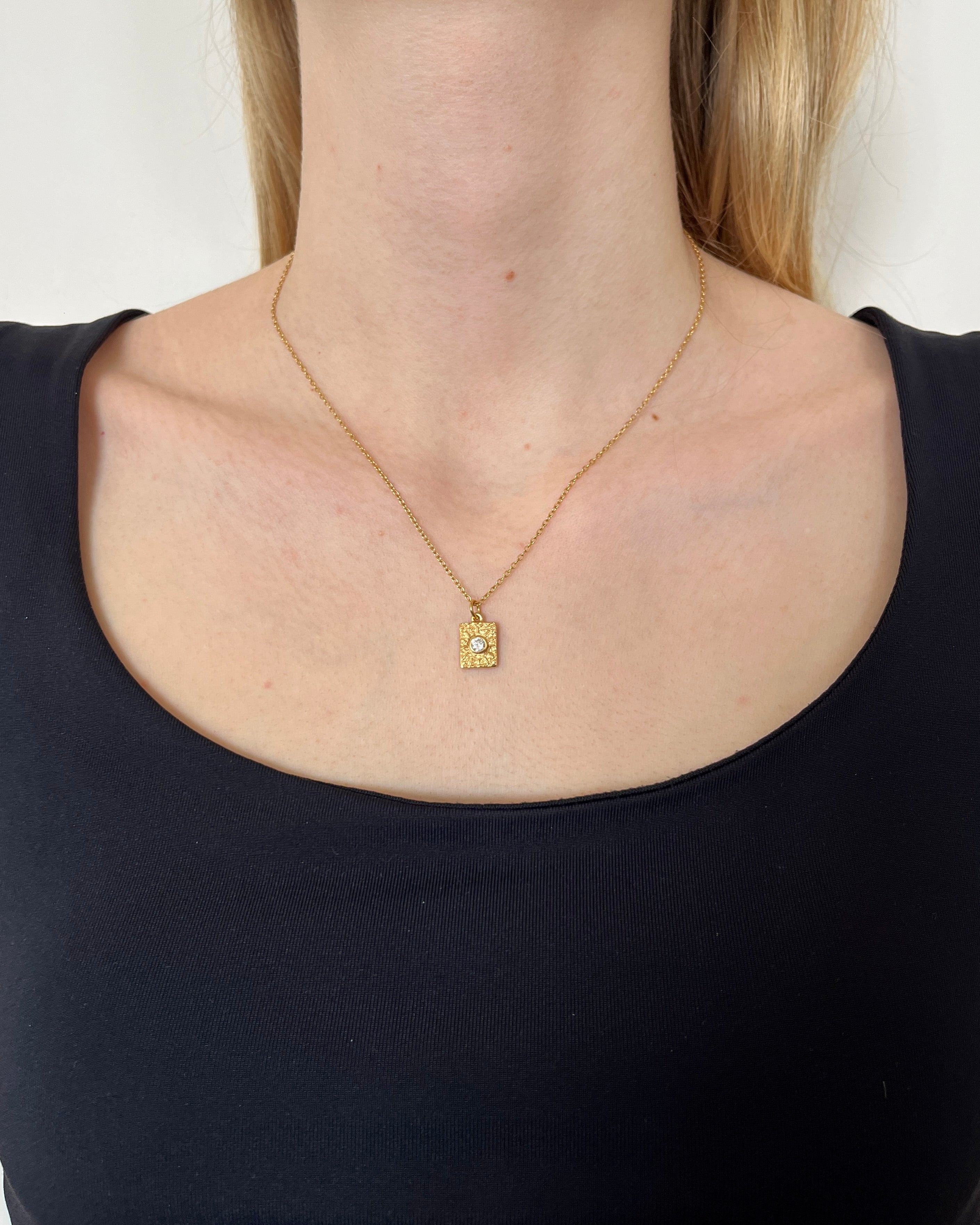 Ein funkelnder klarer Stein bildet das Zentrum dieses extravaganten Schmucks. Die St. Halskette hat einen schönen quadratischen Anhänger, der neben dem Stein in der Mitte des Anhängers eine raue Oberfläche hat. Dies gibt dem Anhänger einen funkelnden Ausdruck.