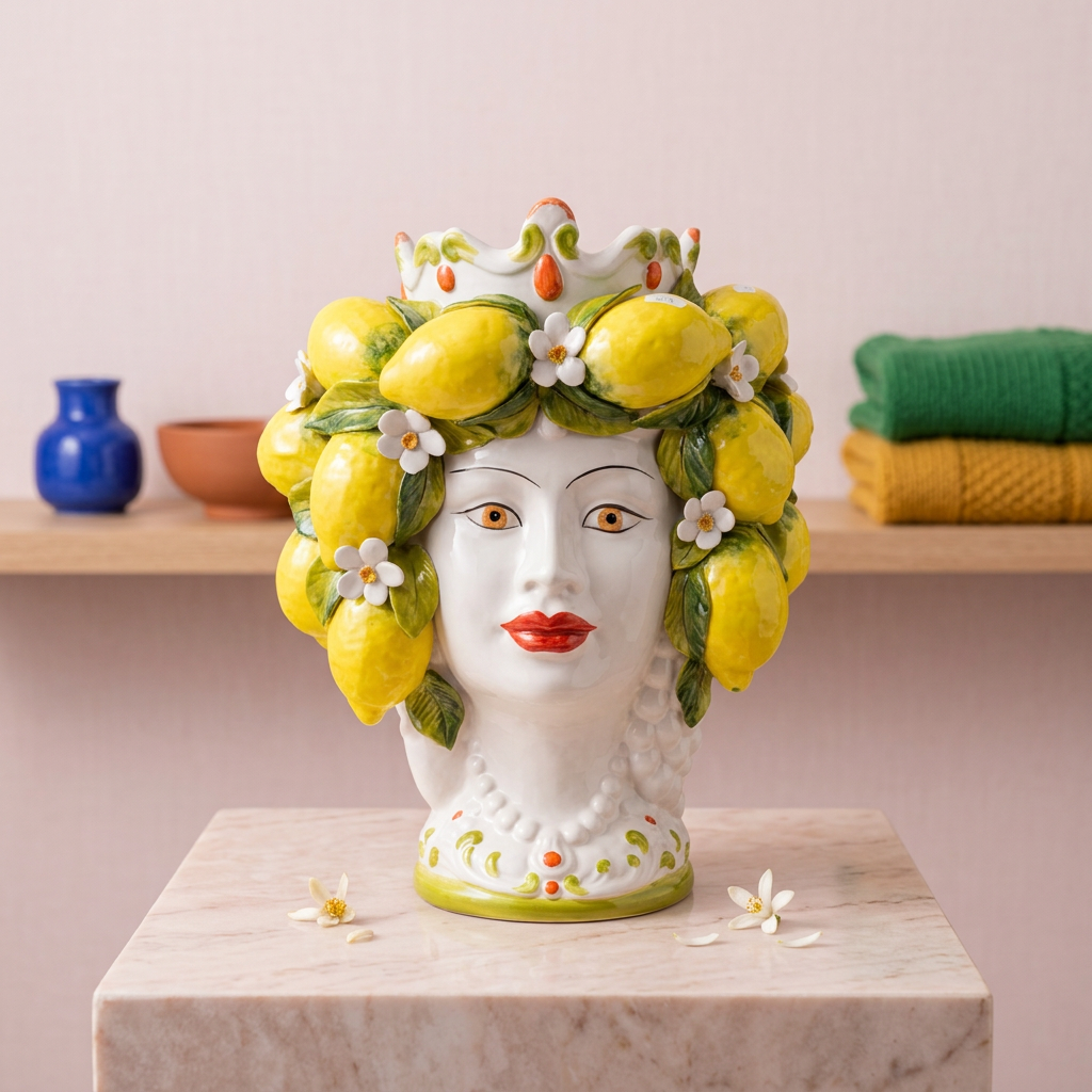 Diese 45 cm hohe Testa Di Moro-Vase steht für eine authentische sizilianische Tradition von großem historischem und künstlerischem Wert. Handgefertigt von einem Familienunternehmen in der zweiten und dritten Generation, zeigt die Vase eine schöne Frau, verziert mit handgemalten Zitronen und feinen Blumendetails, die Ihrem Zuhause einen Hauch italienischer Atmosphäre verleihen.