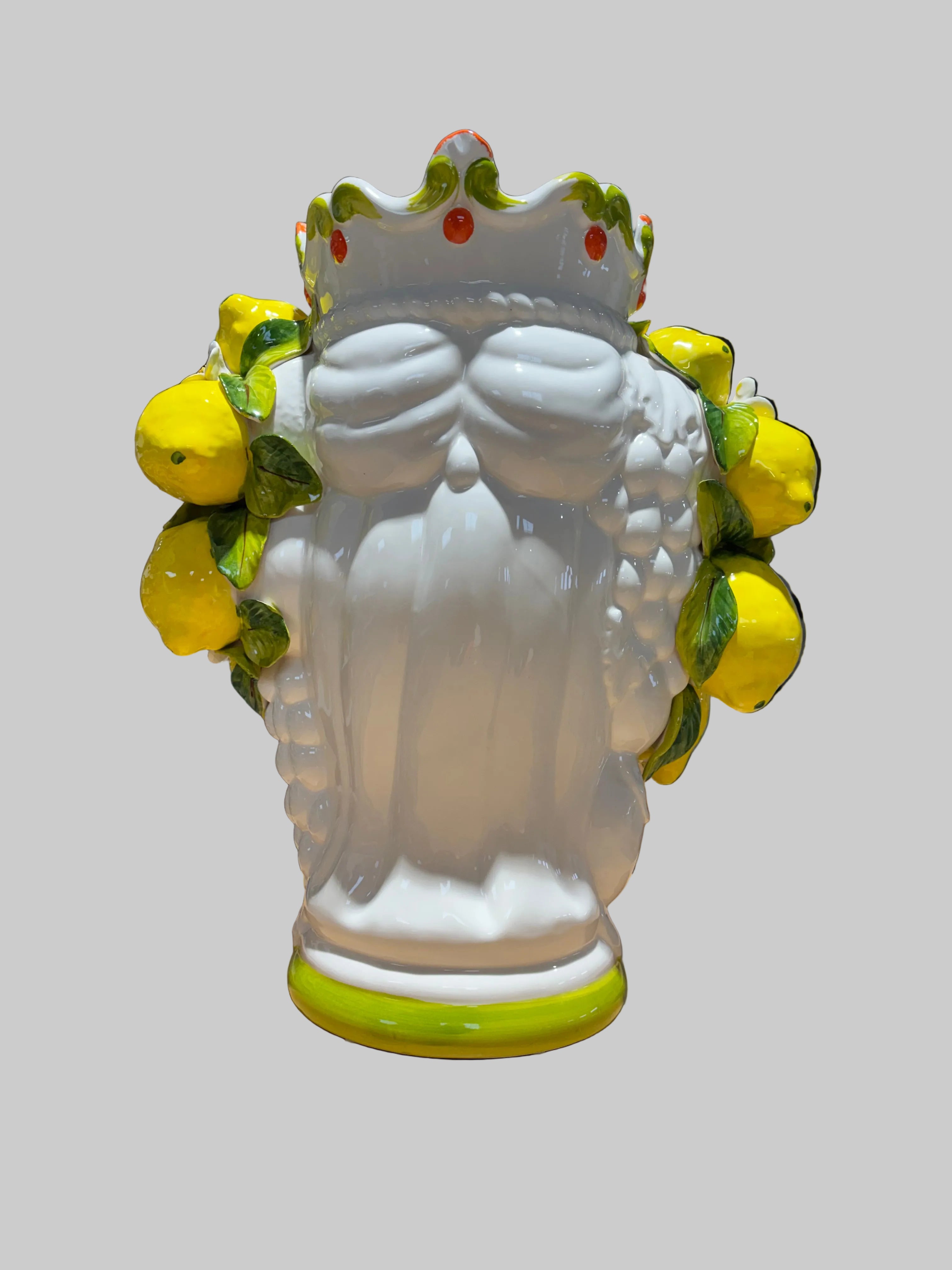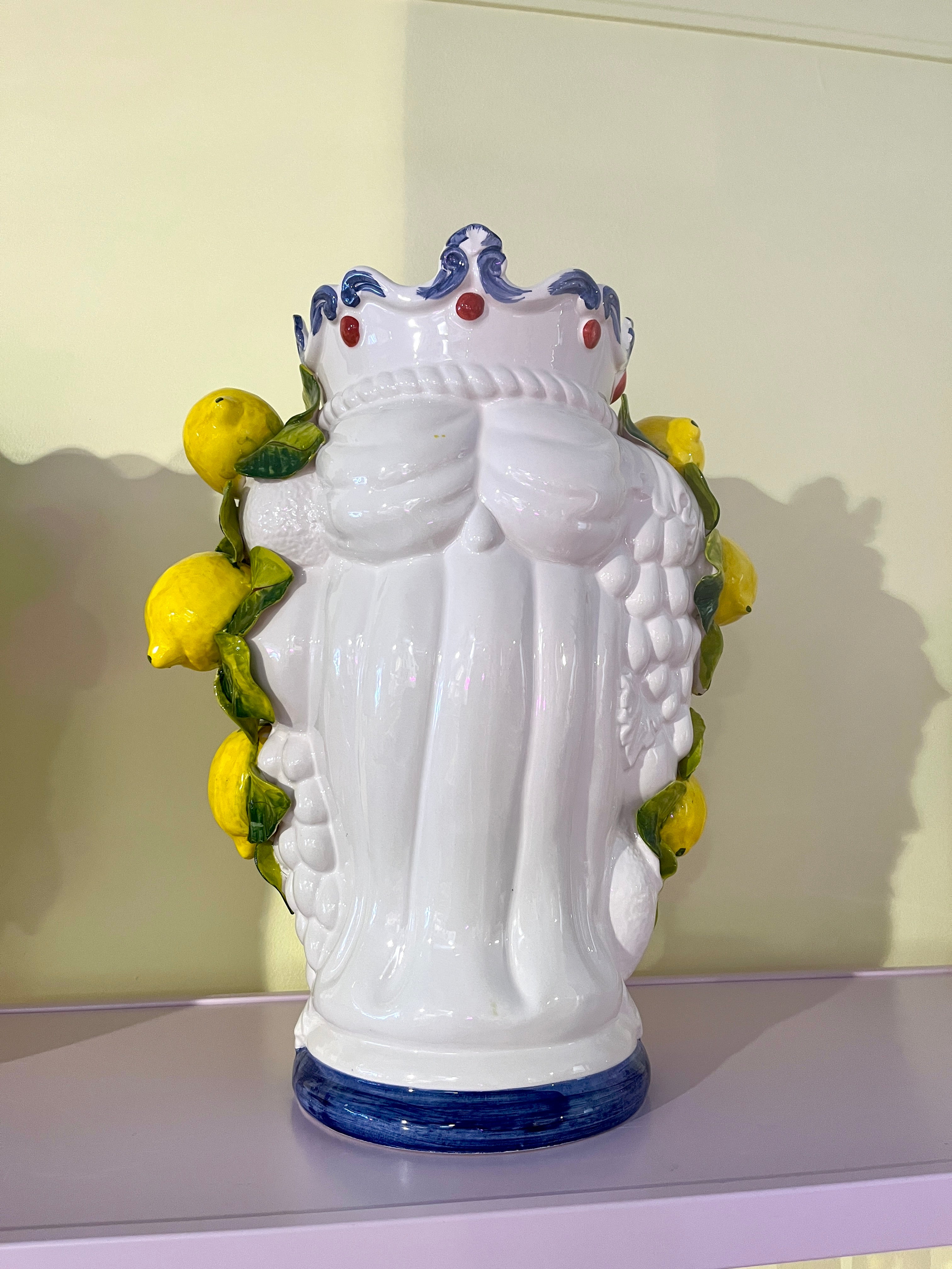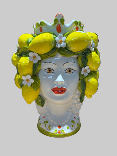 Diese 45 cm hohe Testa Di Moro-Vase repräsentiert eine authentische sizilianische Tradition von großem historischem und künstlerischem Wert. Die Vase wurde von einem Familienunternehmen in zweiter und dritter Generation handgefertigt und zeigt eine schöne Frau, verziert mit handgemalten Zitronen und feinen Blumendetails, die Ihrem Zuhause einen Hauch italienischer Atmosphäre verleihen.