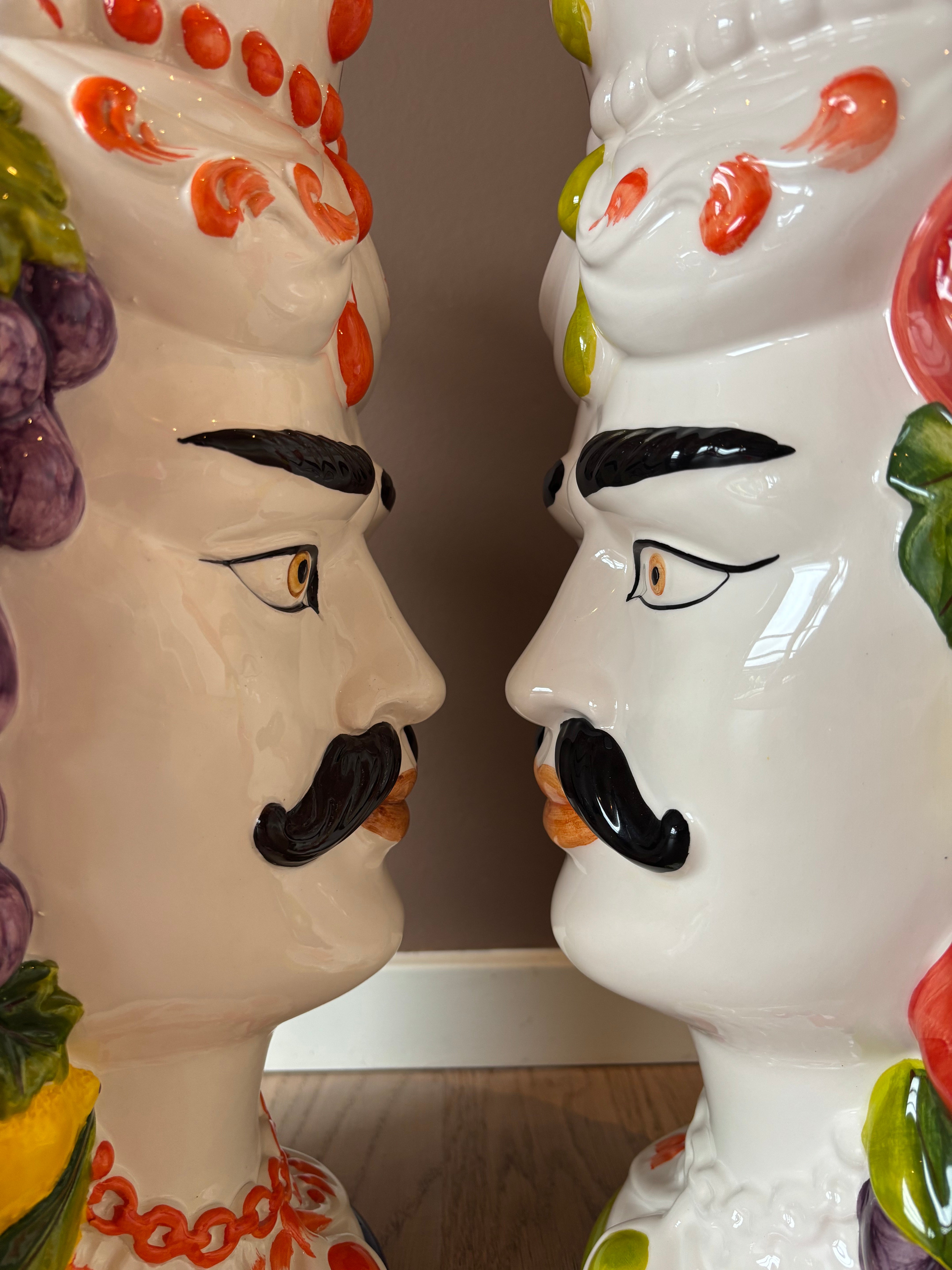 Traditionell werden diese Vasenpaarweise verkauft und stellen einen älteren Mann und eine junge Frau dar, die die Hauptfiguren der sizilianischen Legende sind. Bei Dims Studio können Sie sie jedoch einzeln kaufen.