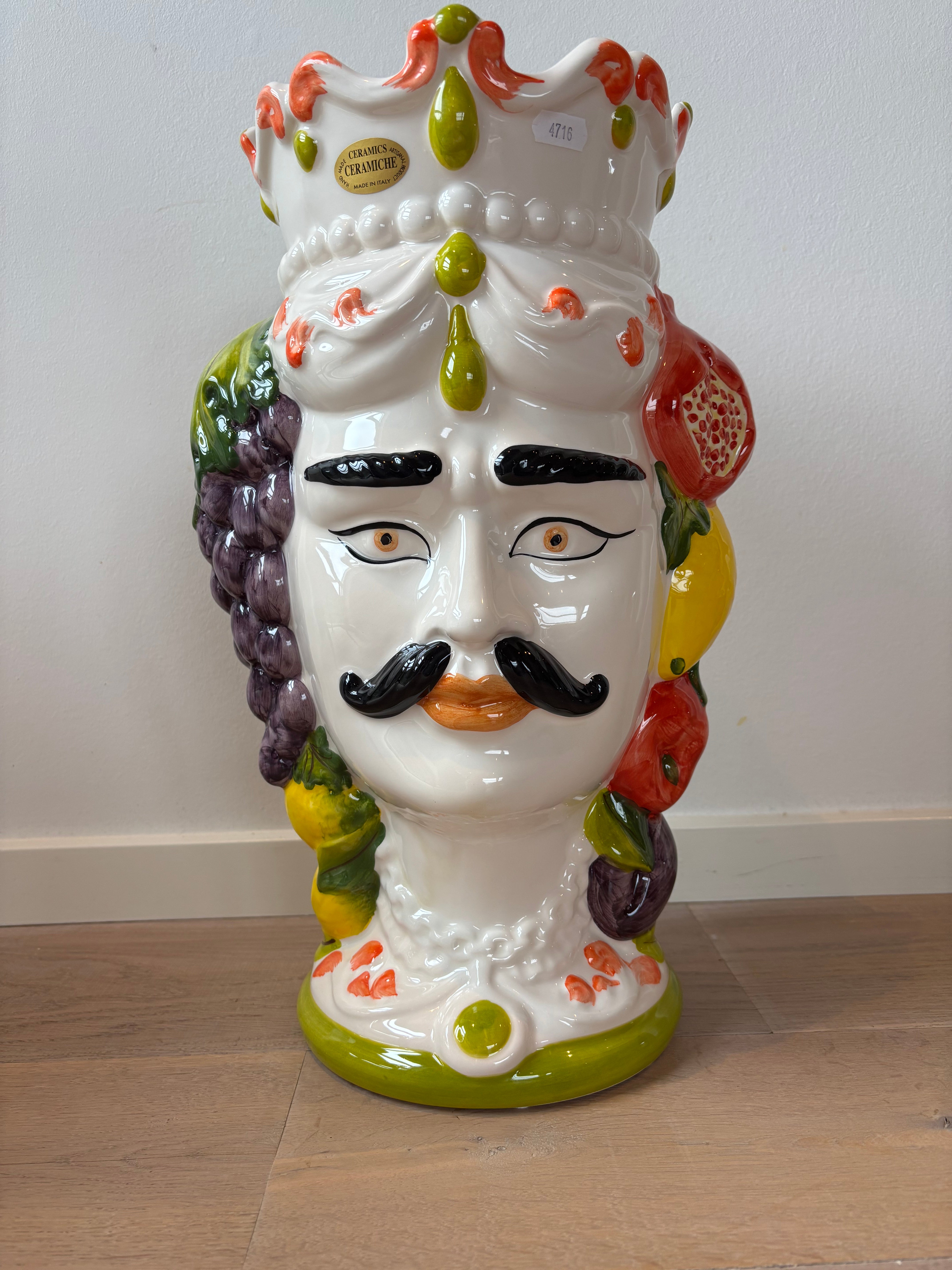 Die 45 cm hohe Vase „Frugt Mand” (Fruchtmann) von Testa Di Moro ist ein authentisches sizilianisches Kunsthandwerk. Diese charakteristische Vase in Form eines Männerkopfes mit Früchten wurde nach stolzen italienischen Keramiktraditionen, die bis ins Jahr 1965 zurückreichen, von Hand bemalt. Jede Vase ist ein Unikat mit kleinen Farbabweichungen, die den handgefertigten Charakter unterstreichen.
