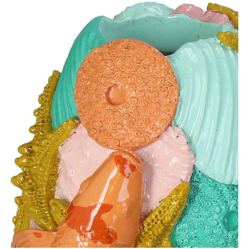 Med sin maritime form skiller denne vase sig ud fra traditionelle vaser og tilfører personlighed til ethvert rum. Den farverige fiskeform gør den til et naturligt blikfang, der kan stå alene som dekoration eller bruges til friske blomster. Polyresin-materialet sikrer både holdbarhed og mulighed for de detaljerede farver.