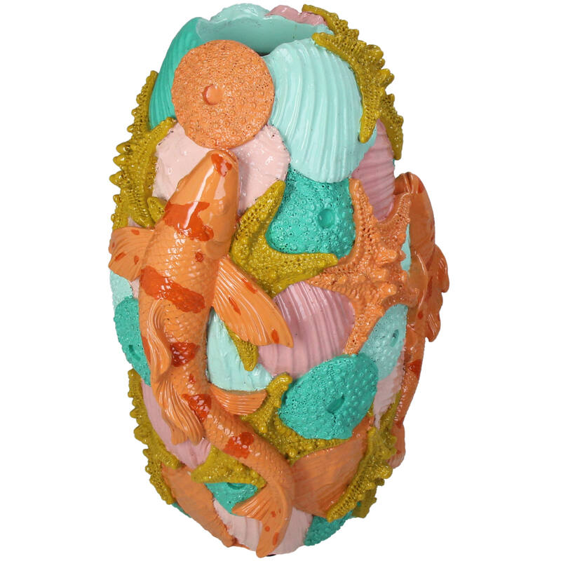 Denne dekorative vase formet som en farverig fisk er et karakterfuldt indretningselement til dit hjem. Med sine velproportionerede dimensioner på 20x17x30,5 cm fungerer den både som en praktisk vase og et kunstnerisk samtaleemne. Vasen er fremstillet i holdbar polyresin og kommer i et livligt multifarvet design.